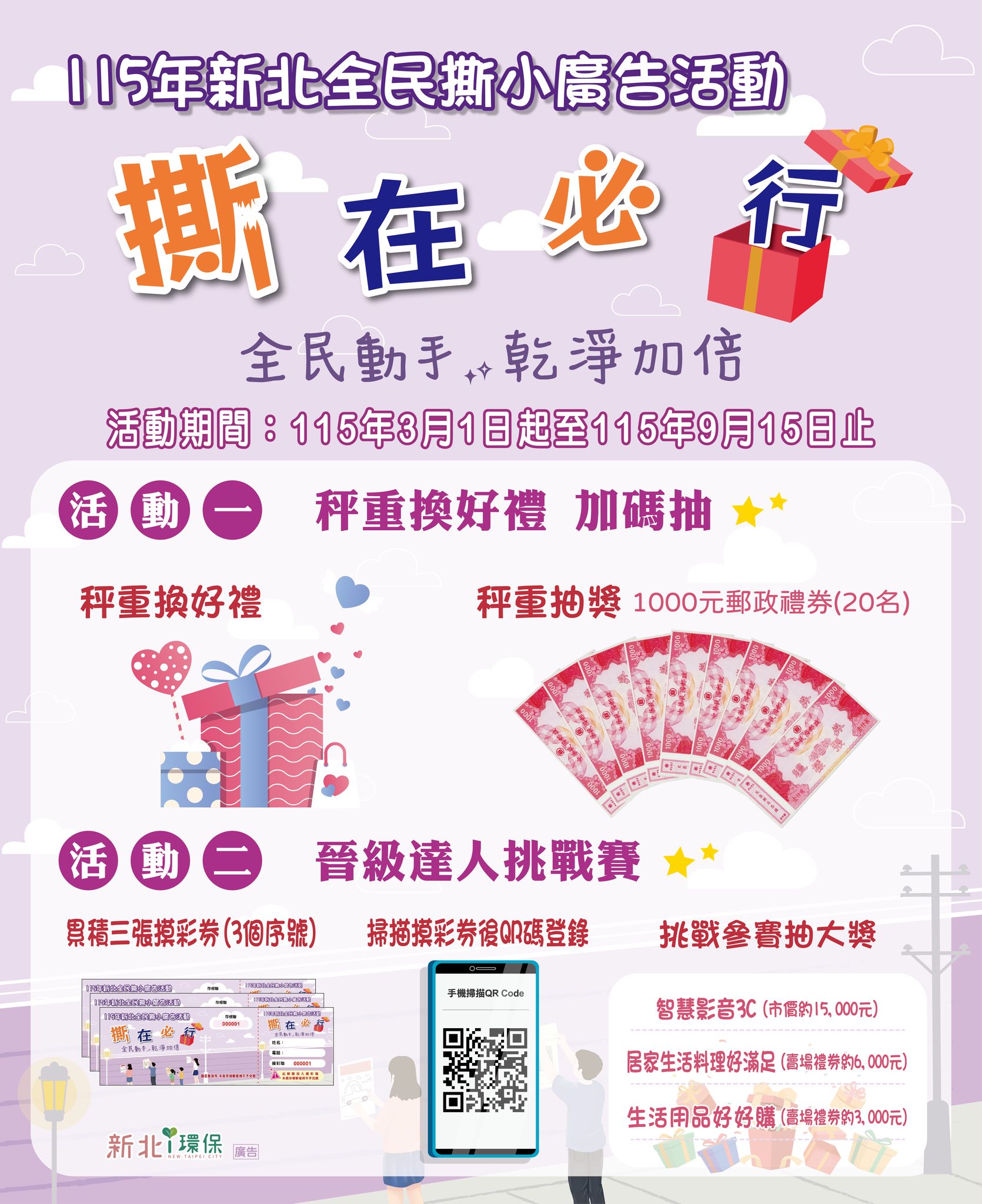 【新北市訊】用畫筆勾勒永續,為地球發聲!新北市環保局辦理「環境教育繪本徵選活動」將邁入第7屆,「115年環境教育繪本徵選簡章」已公告於本局官網,活動呼應「新北環境季」,以「零碳翻轉 新北先行」及「淨零綠生活」為核心推動方向,本次亮點除最高5萬元獎金外,更呼應新北市第二座地質公園「九份金瓜石水湳洞地質公園」的成立,首度與企業合作增設「地質地景守護獎」,邀請全民透過繪本創作,探索新北自然地景之美。 環保局說明,本次徵選分為「國小創作組」、「國高中(職)創作組」及「社會創作組」,各組前三名分別可獲得新臺幣5萬元、3萬元及1萬元獎金,另擇優選出佳作數名,頒發1仟元獎金。收件日期自115年5月4日至6月8日下午5時止,歡迎熱愛創作的市民踴躍參與。徵選簡章及相關參賽資訊可至環保局官網查詢(https://www.epd.ntpc.gov.tw/StaticPage/selection-rules)。 環保局指出,為深化民眾對地質保育的認識,本屆徵選在企業夥伴「新空間國際股份有限公司」的支持下,特別新增「地質地景守護獎」,凡作品內容涉及新北市重要地質景觀,可深化民眾對地質保育的認識,各組將擇優選出一名,額外再頒發3,000元獎金,鼓勵創作者將地景轉化為動人的繪本故事。 環保局表示,新北市擁有豐富的環境素材,創作者可選擇貼近生活的議題進行創作,例如:2050淨零排放、噪音科技執法、雙子星空維區、新北轄內環境教育設施場所及新北市地質景觀等,期盼透過創作力量培養市民環境素養。各組前三名作品不僅製成實體書籍及電子書,更將於9月舉辦成果展,並提供予新北市圖書館典藏,民眾可方便借閱,作為全市推動環境教育宣導的重要資源。 此外,為了協助創作者深入了解參賽規範及繪本創作架構,環保局將於今年3月20日(星期五)下午於本局(新北市板橋區民族路57號)辦理「環境教育繪本創意工作坊」,邀請歷屆得獎作者與繪本作家分享創作經驗與實務技巧,工作坊報名自即日起至3月17日額滿為止(報名網址:https://reurl.cc/QVMMjM),歡迎對繪本創作有興趣的民眾把握機會踴躍參加。 資料詳洽: 綜合規劃科 顏佳慧科長 電話:02-29532111分機4101 新聞聯絡人 黃琡晴專員 電話:02-29532111分機2058 新聞聯絡人 杜承諭 電話:02-29532111分機2059