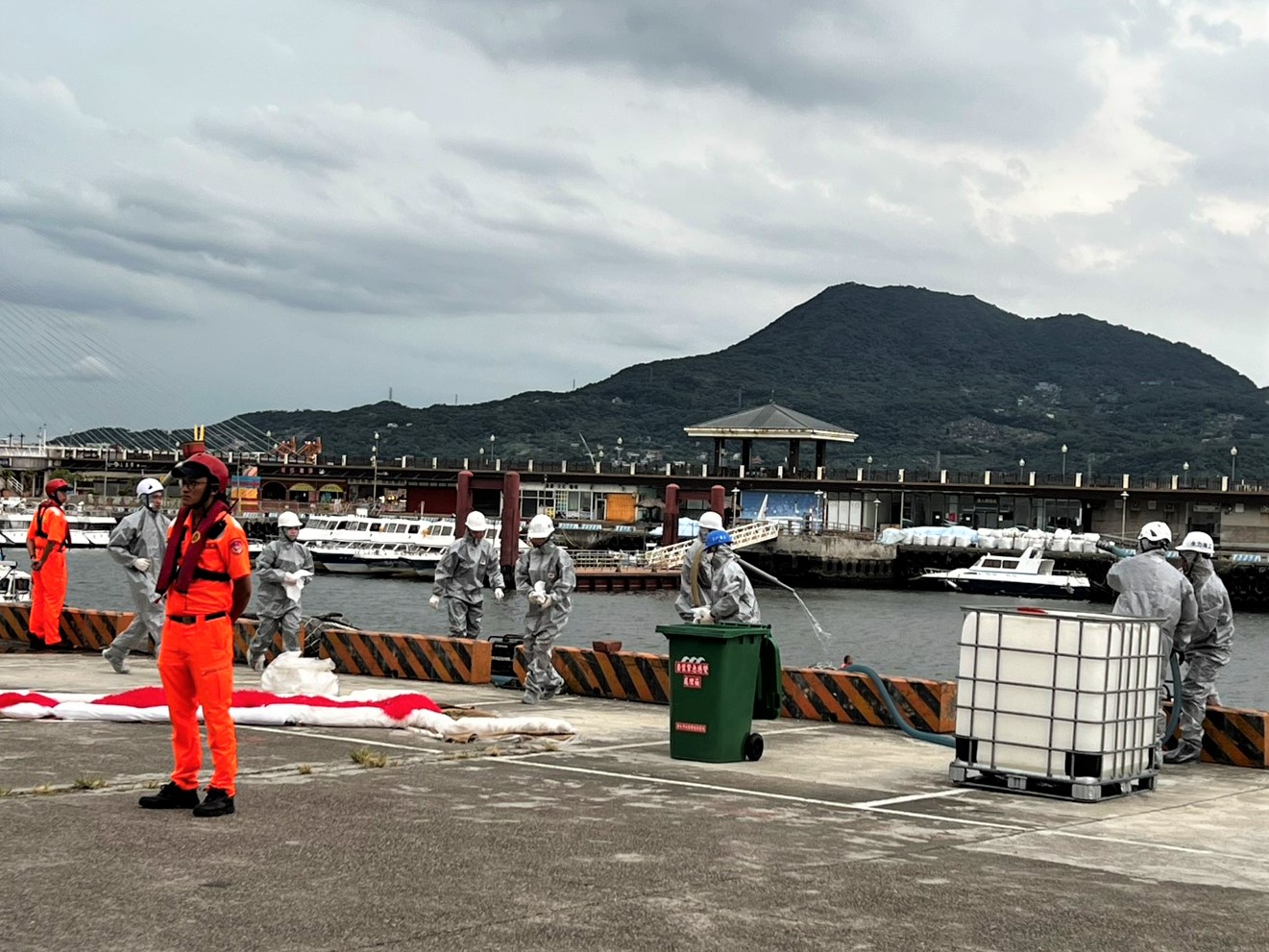 【新北市訊】新北市環保局5日在淡水第二漁港辦理「114年出海口敏感區域海上油污染緊急應變演練」,針對「鄰近環境敏感區域之漁船油艙破裂漏油」進行海洋污染的情境模擬推演。本次演練集結9個單位透過實地操作,從海上與海岸油污圍堵、清除及環境監測,強化各單位協作應變機制,掌握事故發生後的「黃金應變時間」,降低對生態環境衝擊及破壞,提升整體海洋污染防治能力。