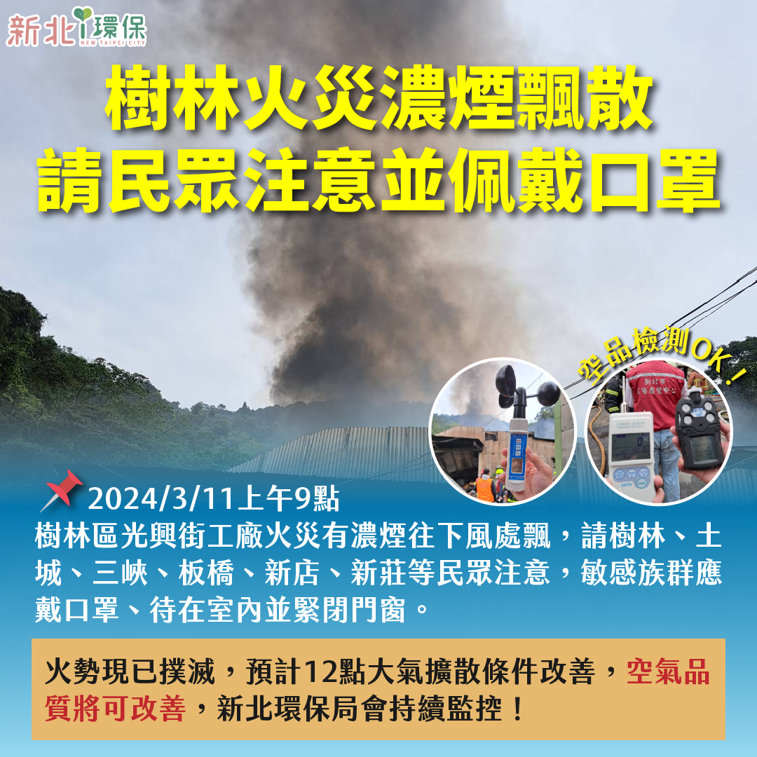 環保局9點52分已透過大氣模擬預測有濃煙往下風處飄散,預估樹林區、土城區、三峽區、新店區、板橋區、新莊區受影響,並在10時已透過社群與網路機制,通報民眾、里長、在地議員、區公所與相關局處,協助提醒民眾注意防範。(