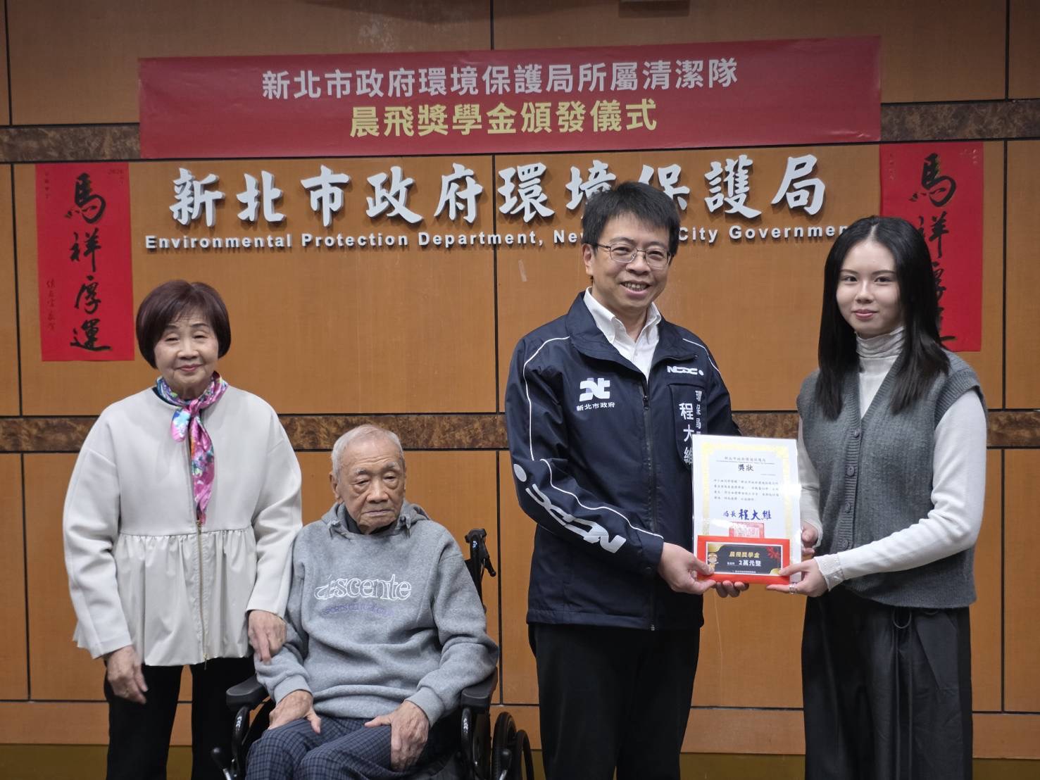 陳念平先生秉持家族關懷社會、培育後進之理念,平日深刻感受到清潔隊員在第一線維護環境、風雨無阻的辛勞付出,鑒於新北市民人數逾400萬,為全國人口最多之直轄市,清潔隊員肩負之服務責任與工作壓力尤為沉重,因此自114年起捐助新北市清潔隊新臺幣100萬元,並承諾連續4年捐款,作為清潔隊員子女就學獎助金及家庭遭逢變故急難救助金,為辛苦的清潔隊員提供堅實後盾。環保局長程大維代表市府致贈感謝狀,表達誠摯謝忱,本次晨飛獎學金共7名學生獲獎,皆為本市清潔隊員就讀於國內公私立大專院校學士班及專科班之子女,學業成績優異,學期成績均達80分以上且品行良好,經審核通過後由程大維局長親自頒發獎狀及2萬元獎學金。