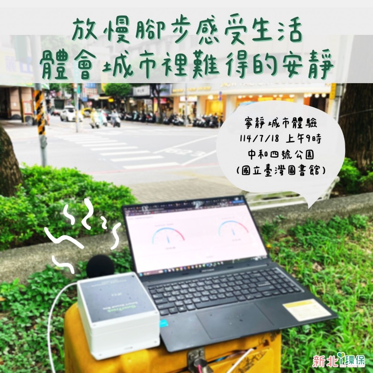 新北市為呼應7月17日「台灣聆聽日」與7月18日「世界聆聽日」,於114年7月18日上午在中和四號公園舉辦「城市寧靜的戰鬥與演習」系列活動。此次活動延續113年獲得總統盃黑客松卓越團隊之「寧靜追蹤師QuietTracker」計畫,結合7月17日城鎮韌性(防空)演習的城市交通靜止時段,利用難得的靜謐片刻,進行街景之聲音觀測,並於7月18日於公園內進行聲景走讀及環境教育體驗,帶領市民以「耳朵」重新認識城市環境,關注都市噪音議題與聲音品質。