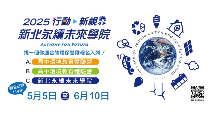 新北市年度暑期環境教育體驗營報名開跑!「新北永續未來學院」營隊活動邁入第六屆,針對不同年齡層規劃3梯次課程,招募對象涵蓋設籍或就學於新北市的國中生、高中職生,以及全國大專院校學生。透過主題式環境永續課程與實地觀摩,引導青年深入環境議題、強化永續行動力,並培育成為「新北永續青年大使」。活動全程免費,報名至6月10日截止。(報名網址:https://reurl.cc/XAapkR)