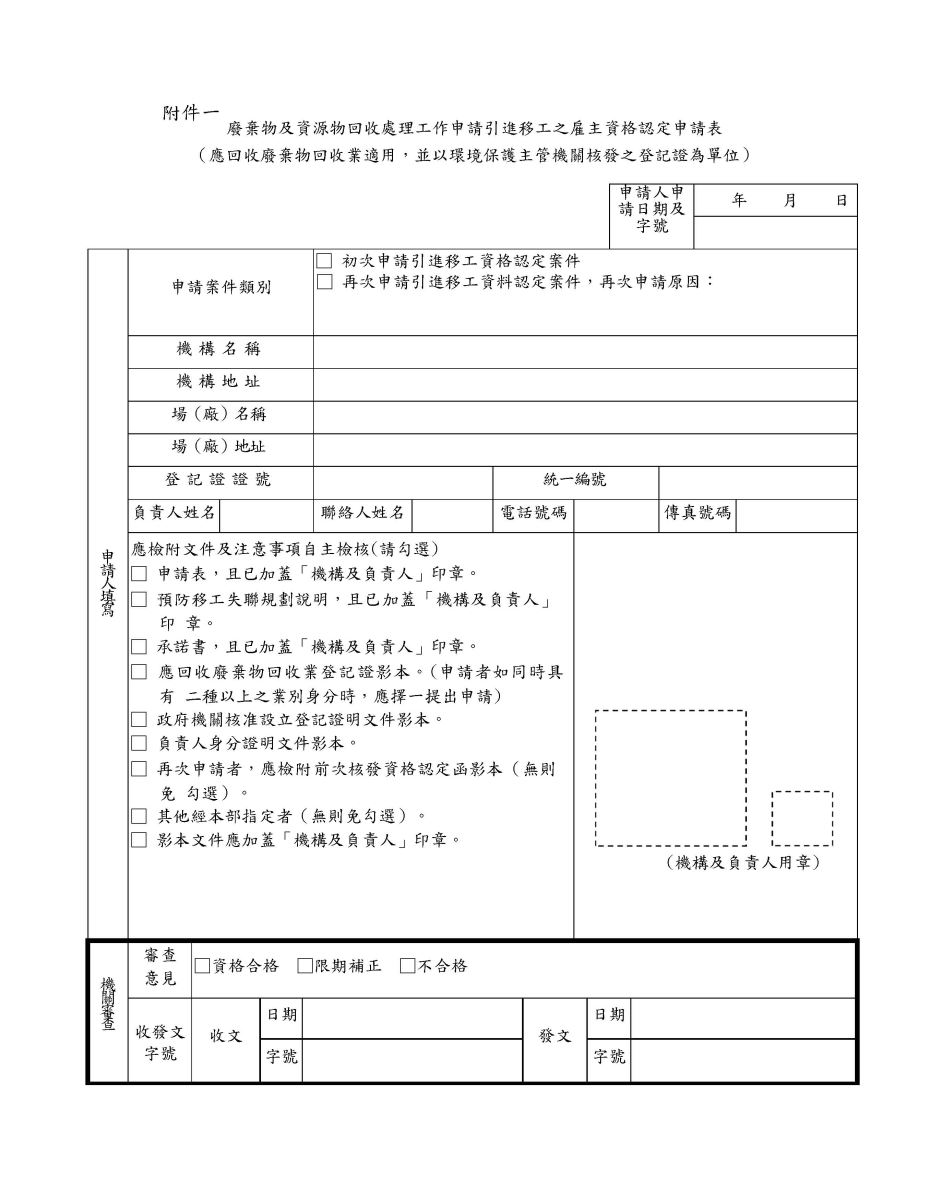 廢棄物及資源物回收處理工作申請引進移工之雇主資格認定申請表