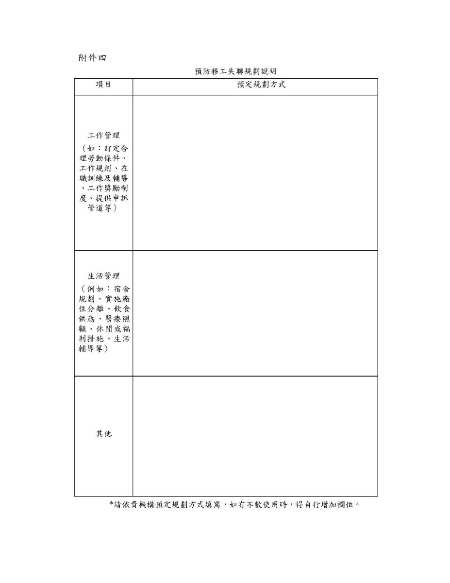 (二)預防移工失聯規劃說明(如附件四)。