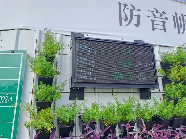 | 營建工地自主監控逕流廢水水質,並利用顯示面板即時監控水質情形,降低汙水排放。 | 工區設置隔音帆布,降低工區內施作噪音對周邊民眾影響。 |