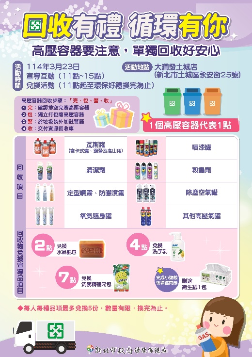 為了宣導民眾正確回收高壓容器的觀念,新北市環保局今年規劃與量販賣場合作,舉辦4場「回收有禮 循環有你」高壓容器回收宣導活動。首場已於114年3月23日上午11時至下午3時在大潤發土城店舉行,民眾只要攜帶2個(含)以上用畢的高壓容器 (如殺蟲劑、瓦斯罐、防曬罐等) 至現場即可兌換水晶肥皂、洗手乳、洗碗精補充包等精美家用小禮品,每人每種禮品最多可兌換5個,最多可兌換15個好禮。