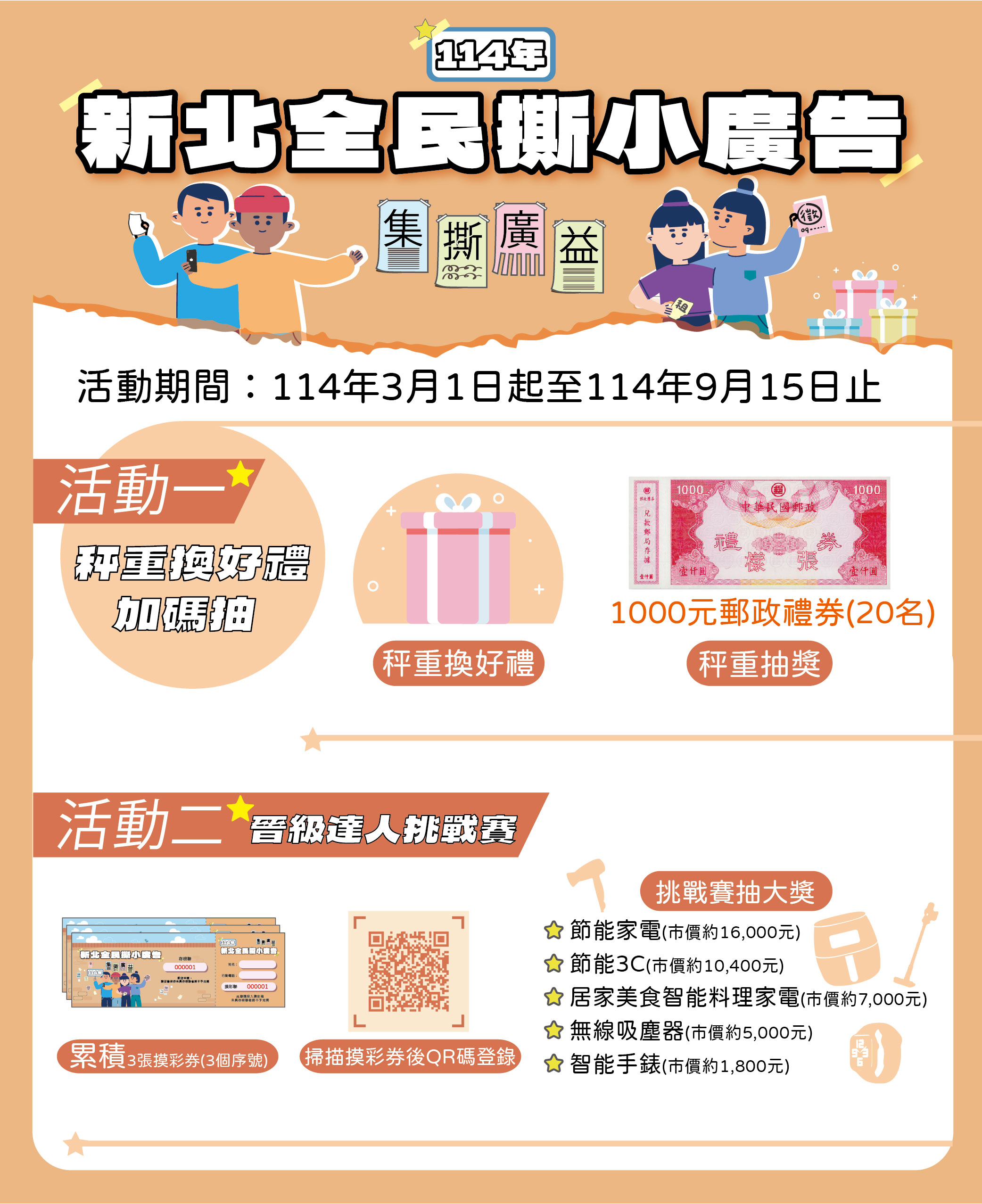 今年「集撕廣益」活動自3月1日至9月15日止,採雙重參與得好禮,活動一為「秤重換好禮加碼抽」,每撕除1公斤小廣告即可兌換環保生活好禮,如衛生紙、專用垃圾袋等,並可額外獲得1張摸彩券,於活動結束後將抽出1,000元郵政禮券共20名。另外活動二的「晉級達人挑戰賽」特別將門檻降低從原本的5公斤調降為3公斤,民眾只要撕除滿3公斤違規小廣告,送交新北市任一區清潔隊回收,就可參與活動二「晉級達人挑戰賽」,民眾累計獲得3張摸彩券後,掃描摸彩券上QRcode填寫相關資料並上傳3張摸彩券存根聯照片,有機會再抽大獎,包含節能家電、智能3C產品等16名獎項,總價值超過7萬元,獎品豐富。