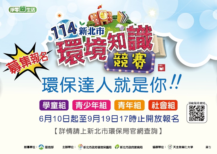 「114年新北市環境知識競賽」將於9月27日(星期六)在輔仁大學登場,競賽分為學童組、青少年組、青年組及社會組等4個組別,6月10日(星期二)正式開放網路報名,凡報名完賽即可獲得新臺幣100元商品禮券,各組第一名更可獲得獎勵金6,000元。