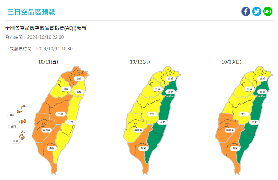 | 全國各空品區空氣品質指標(AQI)預報圖 | 環境部空品預報北部空品不良情形 |