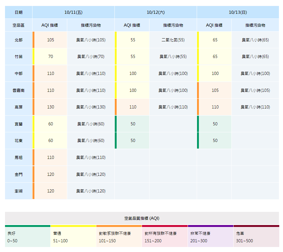 因東北風挾帶境外污染物進入台灣,10月11日上午萬里、富貴角測站AQI已達100,達到橘色預警等級,指標污染物為臭氧(ppm 8小時平均值),且受光化作用影響,全市午後臭氧濃度可能再升高。