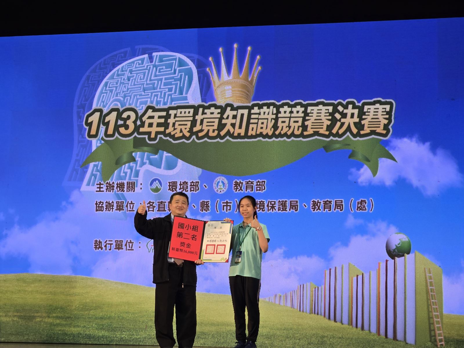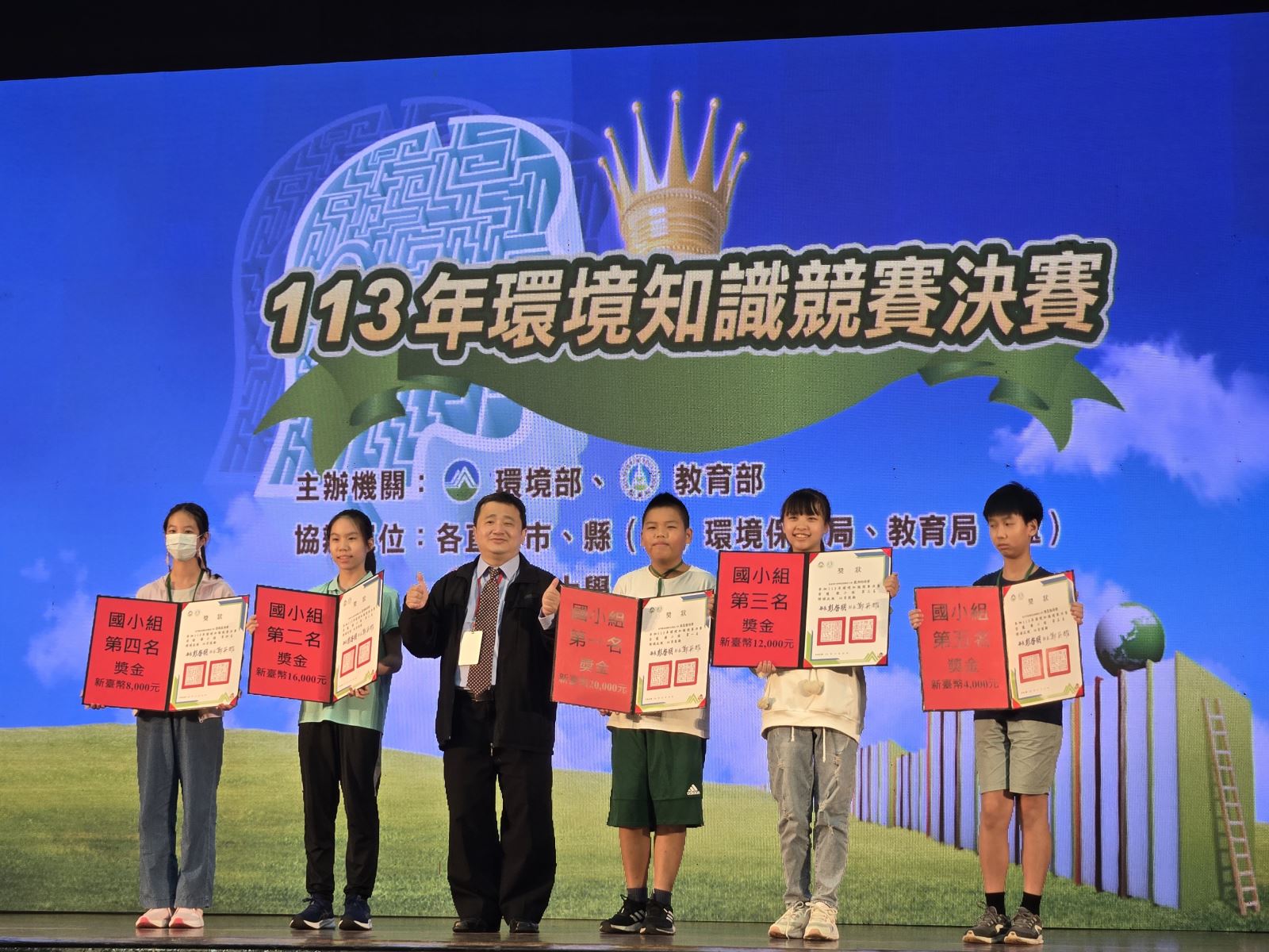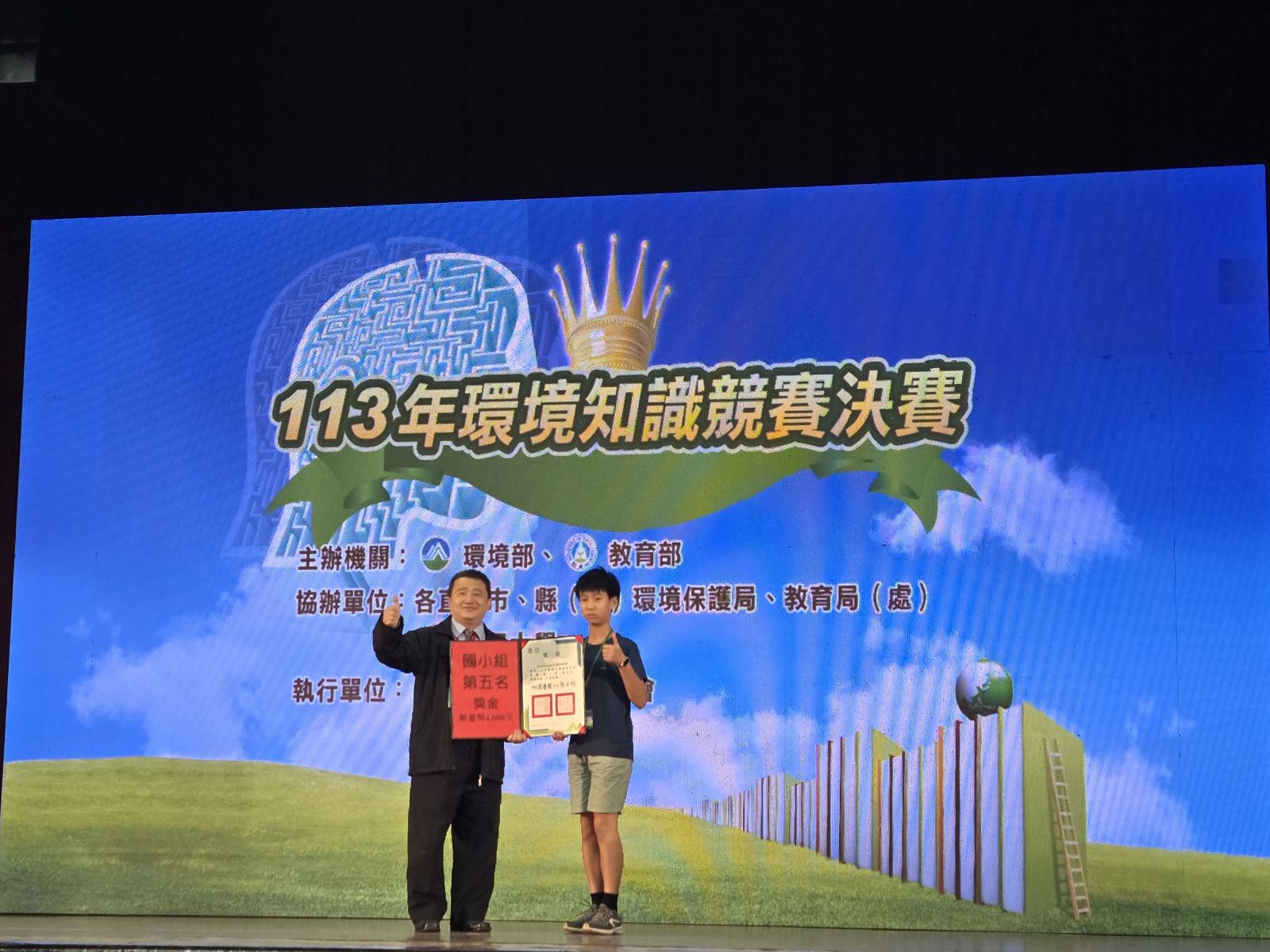 | 「113年環境知識競賽決賽」國小組前五名合影 | 秀峰國小高唯甄同學獲得國小組第二名 |