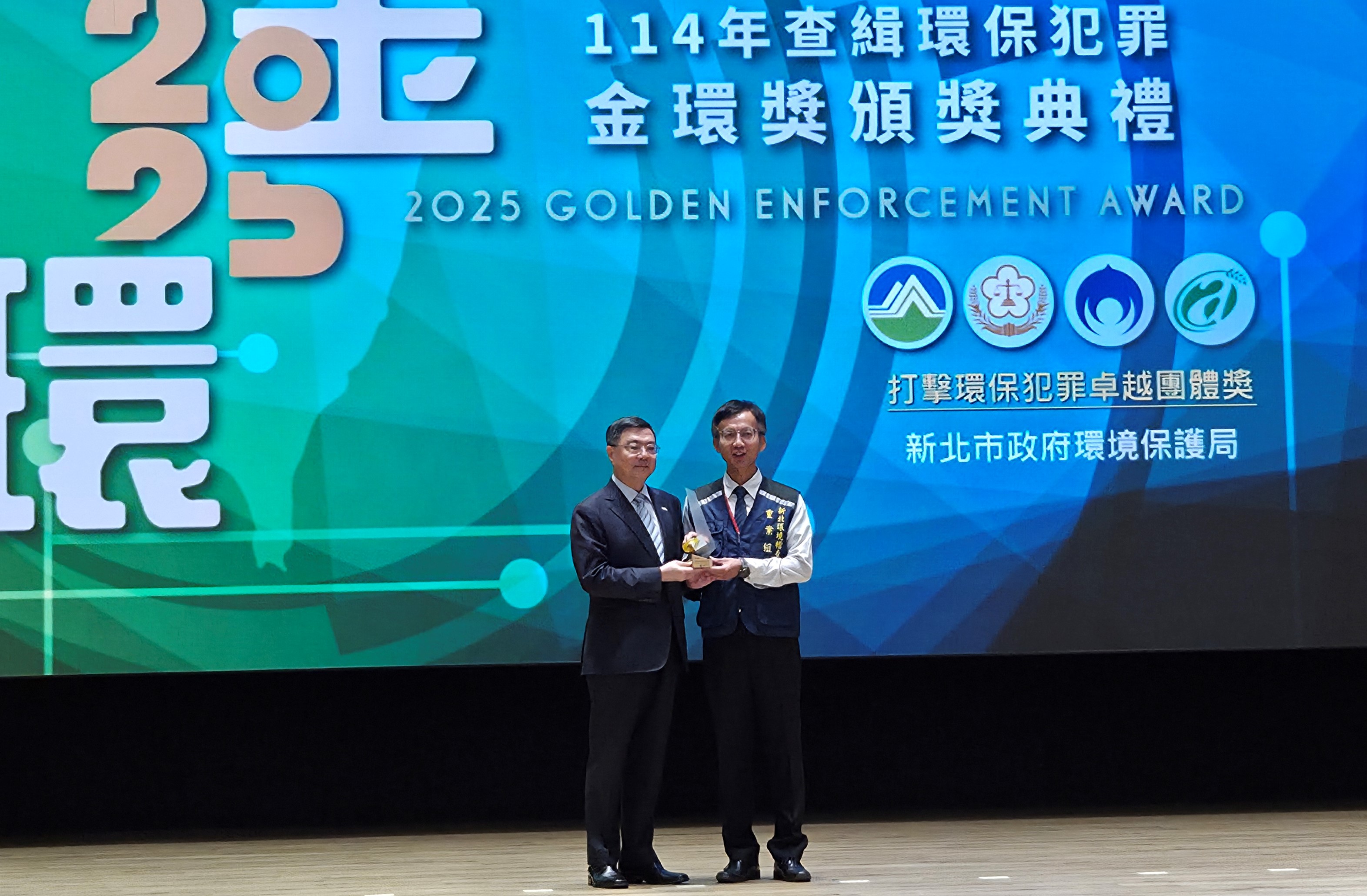新北市環保局再傳捷報!由環境部、法務部共同舉辦的「金環獎」評選中,新北市環保局再度榮獲114年度打擊環保犯罪卓越團體獎及3項個人獎,成為全國 金環獎1 唯一連續4年獲此殊榮的地方環保機關,展現新北市在環境稽查與環保犯罪查緝領域的堅定決心與卓越實力。