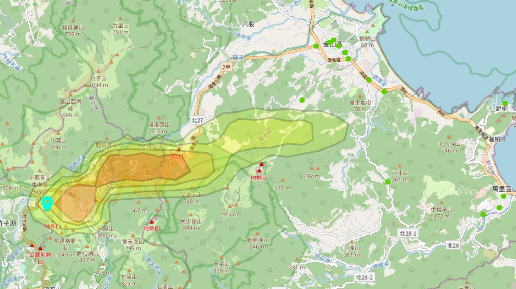 | 圖一、1小時後擴散狀況模擬圖,可能影響台北市北投區、新北市萬里區及金山區。 | 圖二、新北市萬里區及金山區山區處於火災下風處,空氣品質感測器無異常情形。 |