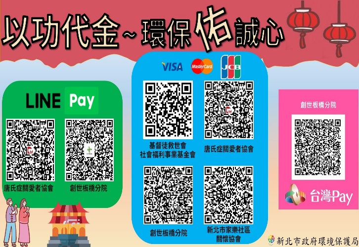| 推廣新北環境友善祭祀,民眾可至新北市好日子愛心大平台(https://goodday.ntpc.gov.tw/pwntpc/ )或四大超商事務機參加以功代金,響應活動做愛心。 | |