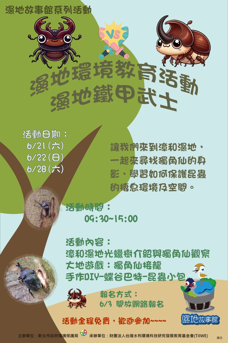讓我們來到漳和濕地,一起來尋找獨角仙的身影,學習如何保護昆蟲的棲息環境及空間。 活動日期: 6/21(六)、6/22(日)、6/28(六) 每場次名額限25位,額滿為止。 活動...