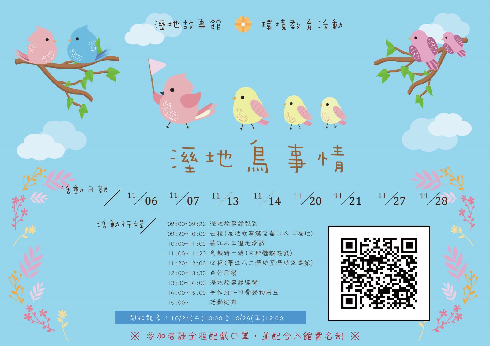 一邊觀察鳥兒,一邊聽專家導覽,一同認識各種鳥類及吸收牠們的生活智慧吧! 活動日期: 11/15(六)、11/22(六)、11/29(六) 活動行程: 09:00~09:20濕地...