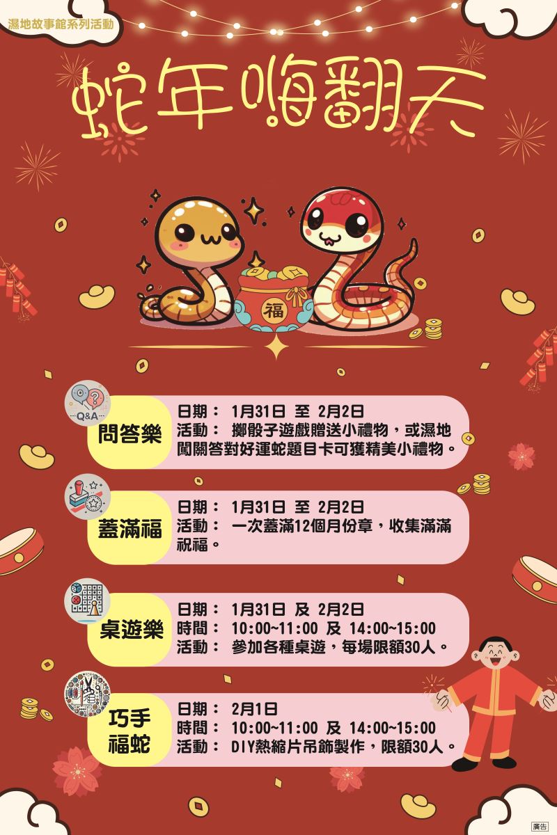 迎新年~ 蛇年嗨翻天活動 歡迎大朋友、小朋友們,一起來濕地故事館,歡慶共度春節連續假期! 【活動時間】 114年1月31日(大年初三)~2月2日(大年初五) 【活動內容】 蛇年問答...