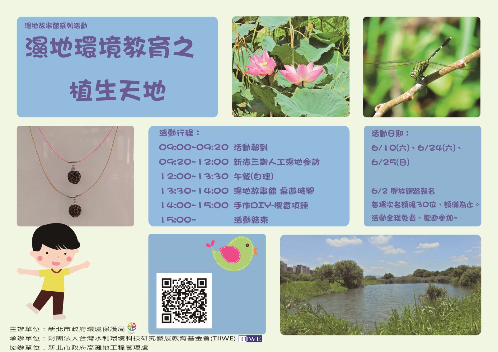 在新海三期人工濕地裡 有著許許多多的植物 一起來探索美麗的植物天地吧! ※活動全程免費,每場次限30名額,額滿為止。 活動日期: 6/10(六)、6/24(六)、6/25(日...