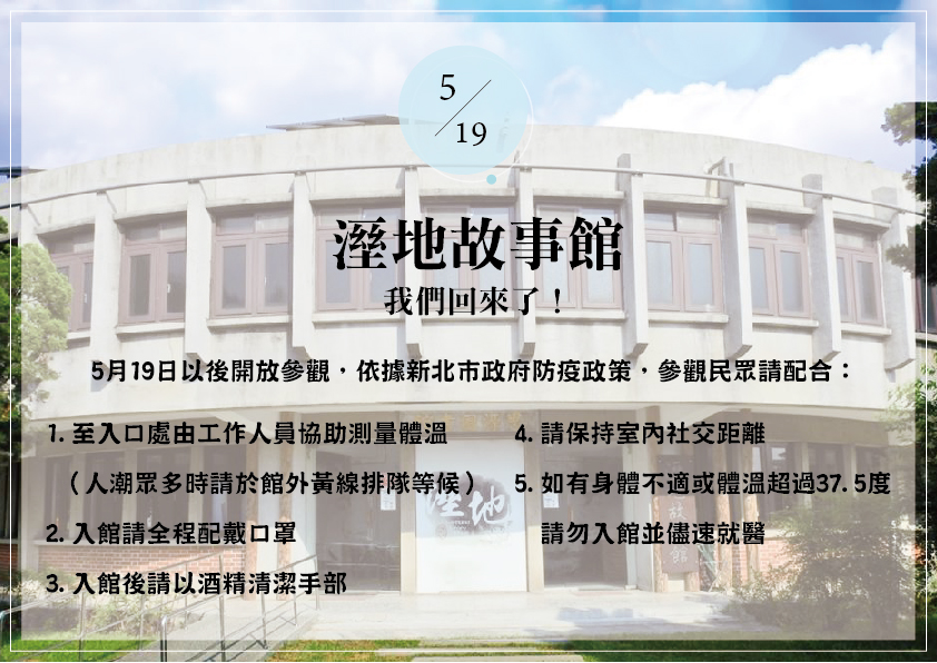 因應2019新型冠狀病毒肺炎(COVID-19)疫情影響,配合新北市政府防疫措施,故事館將暫時停止開放,造成您的不便敬請見諒。 提醒大家勤洗手、保持清潔、注意自身健康狀況,大家攜手來防疫! ...