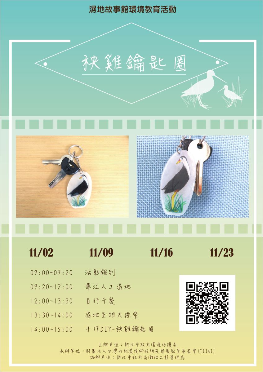 拜訪都會中秘境—華江人工濕地~與快樂的鳥兒、悠游的魚群一同在華江濕地玩耍。 DIY秧雞科小吊飾,將自然之美帶入生活,親手製作屬於自己的鑰匙圈。 快來濕地故事館一同探索濕地的美好吧!! ...