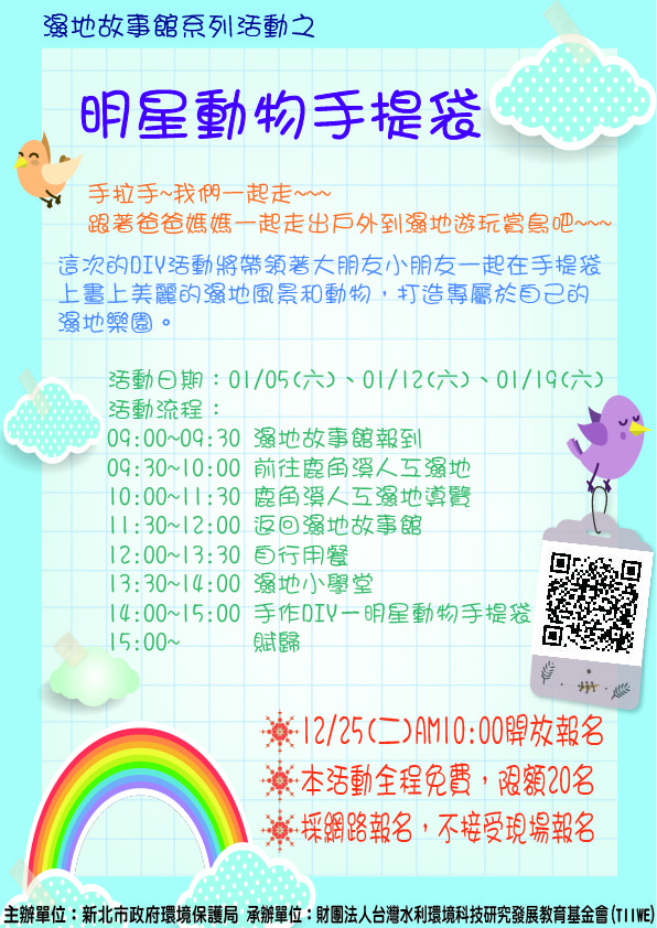 手拉手~我們一起走~~~ 跟著爸爸媽媽一起走出戶外到濕地遊玩賞鳥吧~~~ 這次的DIY活動將帶領著大朋友小朋友一起在手提袋上畫上美麗的濕地風景和動物,打造專屬於自己的濕地樂園。 濕地故事...