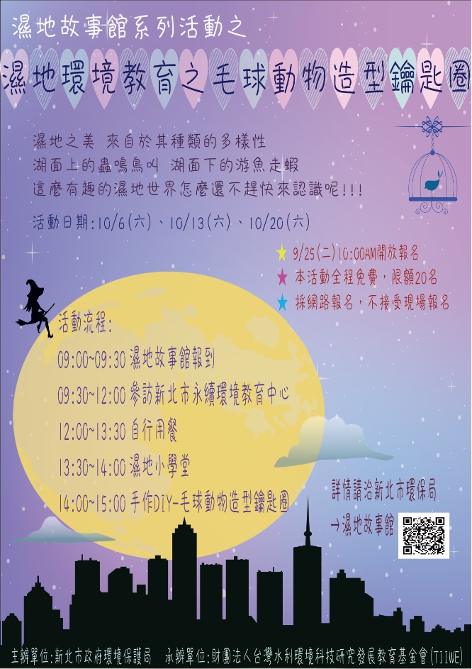 濕地之美來自於其種類的多樣性 湖面上的蟲鳴鳥叫,湖面下的游魚走蝦。 這麼有趣的濕地世界怎麼還不趕快來認識呢!!! 濕地故事館系列活動【濕地環境教育之毛球動物造型鑰匙圈】 活動日期:10...