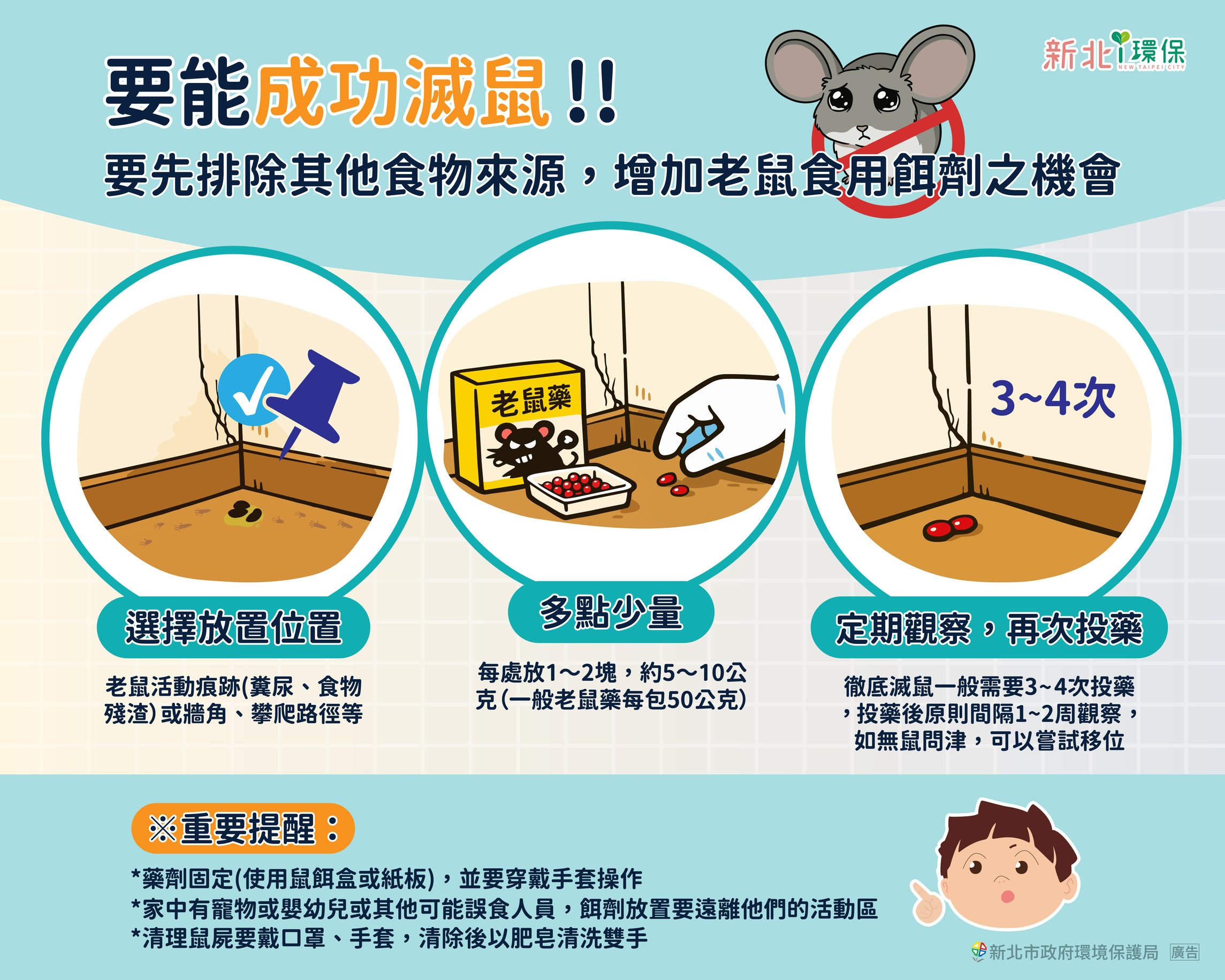 民眾若於居家或社區發現老鼠蹤跡,可視情況使用殺鼠劑,並掌握「靠牆放、多點少量、持續觀察」三大原則